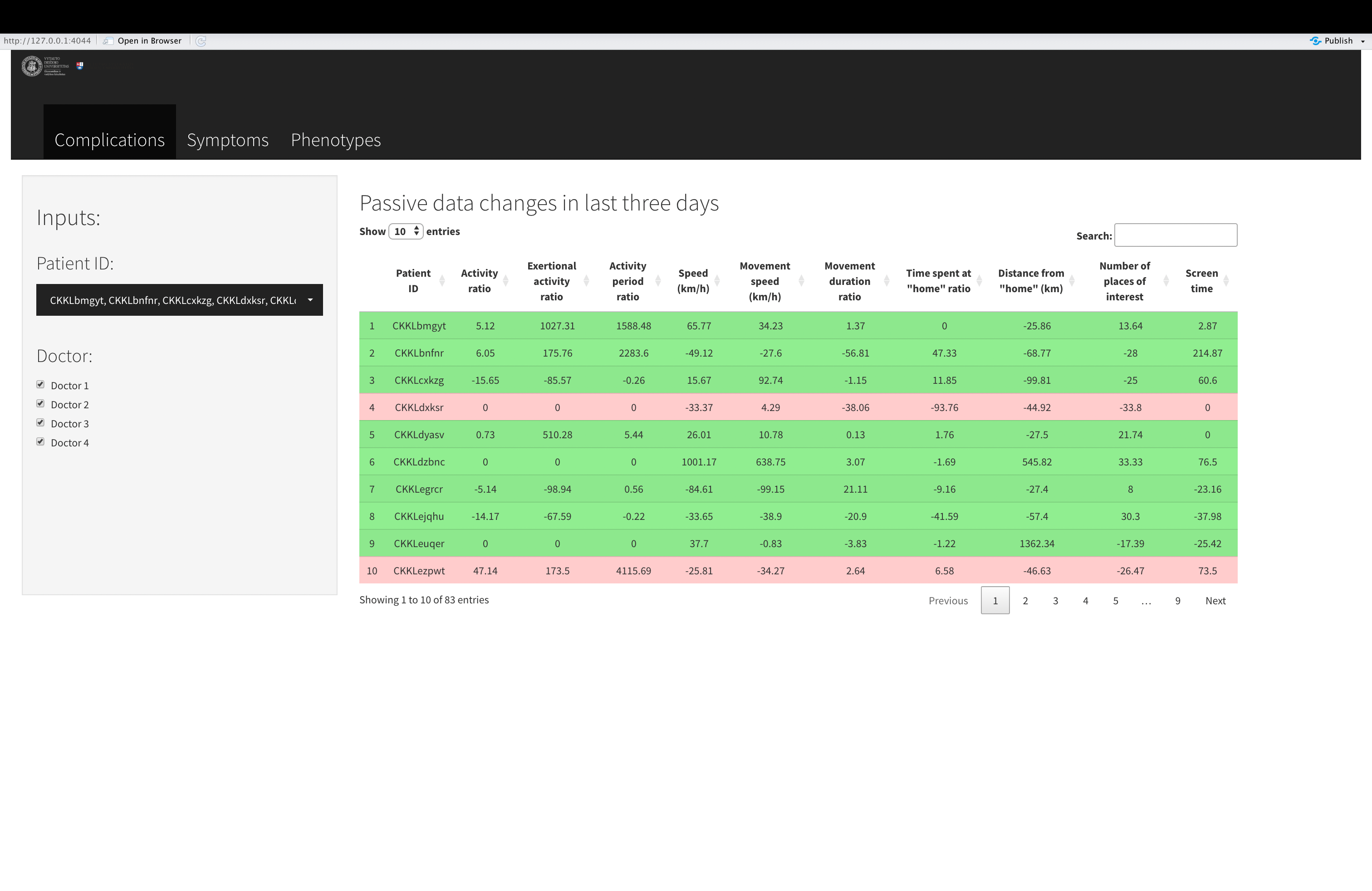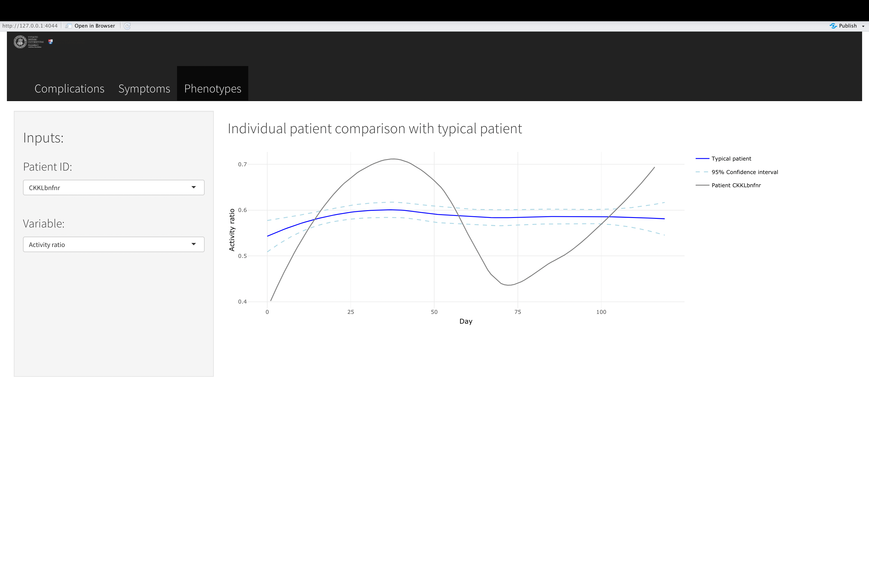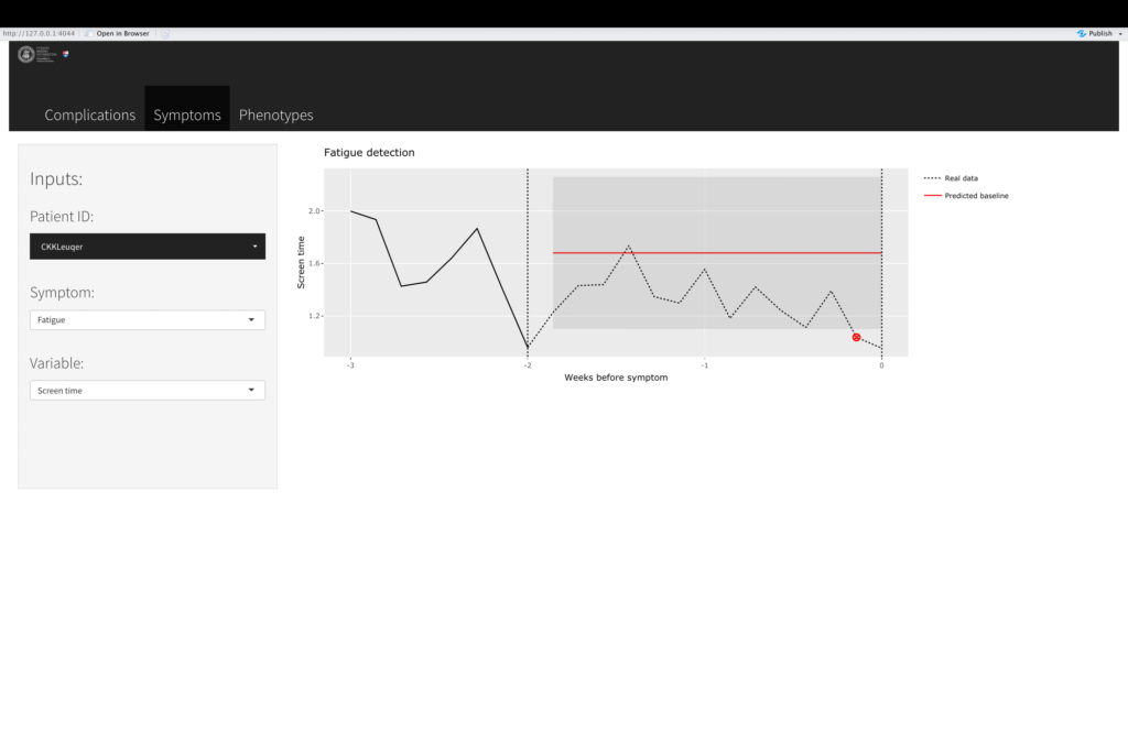 Iš sukauptų pasyvių duomenų apie paciento elgseną nesant simptomų pasireiškimui, sudarytos prognozuojamos aktyvumo ir socialumo parametrų kreivės, nusakančios kaip pacientas turėtų elgtis sekančias dvi savaites, jei simptomas jam nepasireikštų. Šiam tikslui panaudoti laiko eilučių modeliai: ARIMA, Holt Winter metodas, TBATS, LSTM ir GRNN. Modeliai su minimaliomis bandymo paklaidomis buvo parinkti kiekvienam kintamajam atskirai. Sekantis žingsnis, išanalizuoti, ar faktinės vertės skiriasi nuo prognozuojamos trajektorijos. Jei tikroji vertė yra žemiau apatinės 95 % pasikliautinojo intervalo ribos (ar viršija viršutinę laiko namuose ribą), daroma prielaida, kad potencialai atsirado atitinkamas simptomas arba įvyko pablogėjimas. Atlikti tyrimai parodė, ekrano naudojimo trukmė gali nusakyti visus tris simptomus: depresiją, nuovargį ir vėmimą. Pacientų atstumo nuo namų pokyčiai nusako depresiją ir nuovargį, o vidutinė judėjimo trukmė – depresiją.